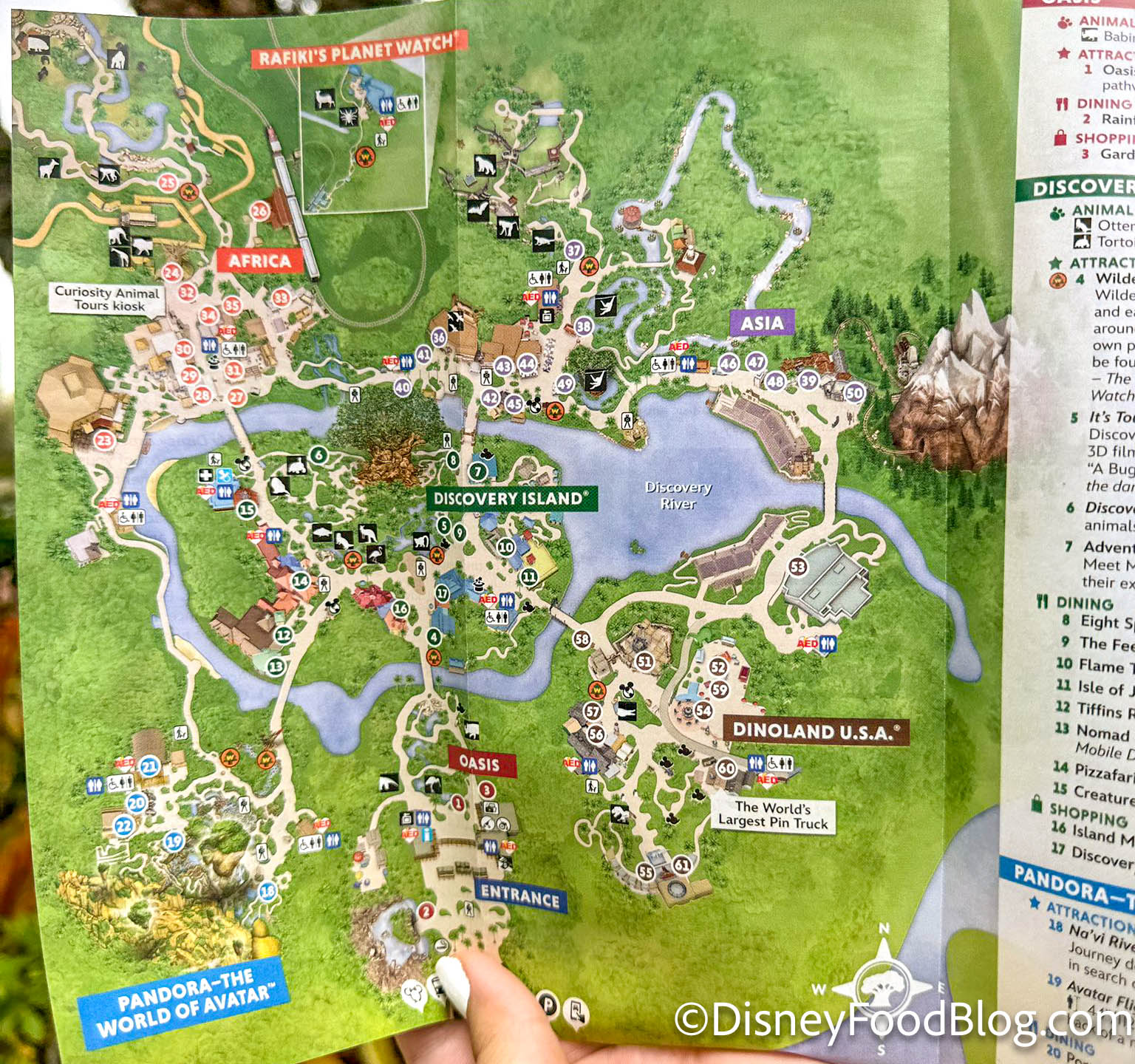 When you open the front page, you’re greeted by the Alive with Magic spread, which includes some of Animal Kingdom’s biggest highlights. It mentions popular entertainment, character meets, dining, and animal experiences. It also gives a little guide to the My Disney Experience app. The map itself is where we spotted the changes — there are new character meet-and-greet icons in DinoLand, U.S.A., and The Oasis. These mark the spots where Goofy, Pluto, and Pocahontas meet now.