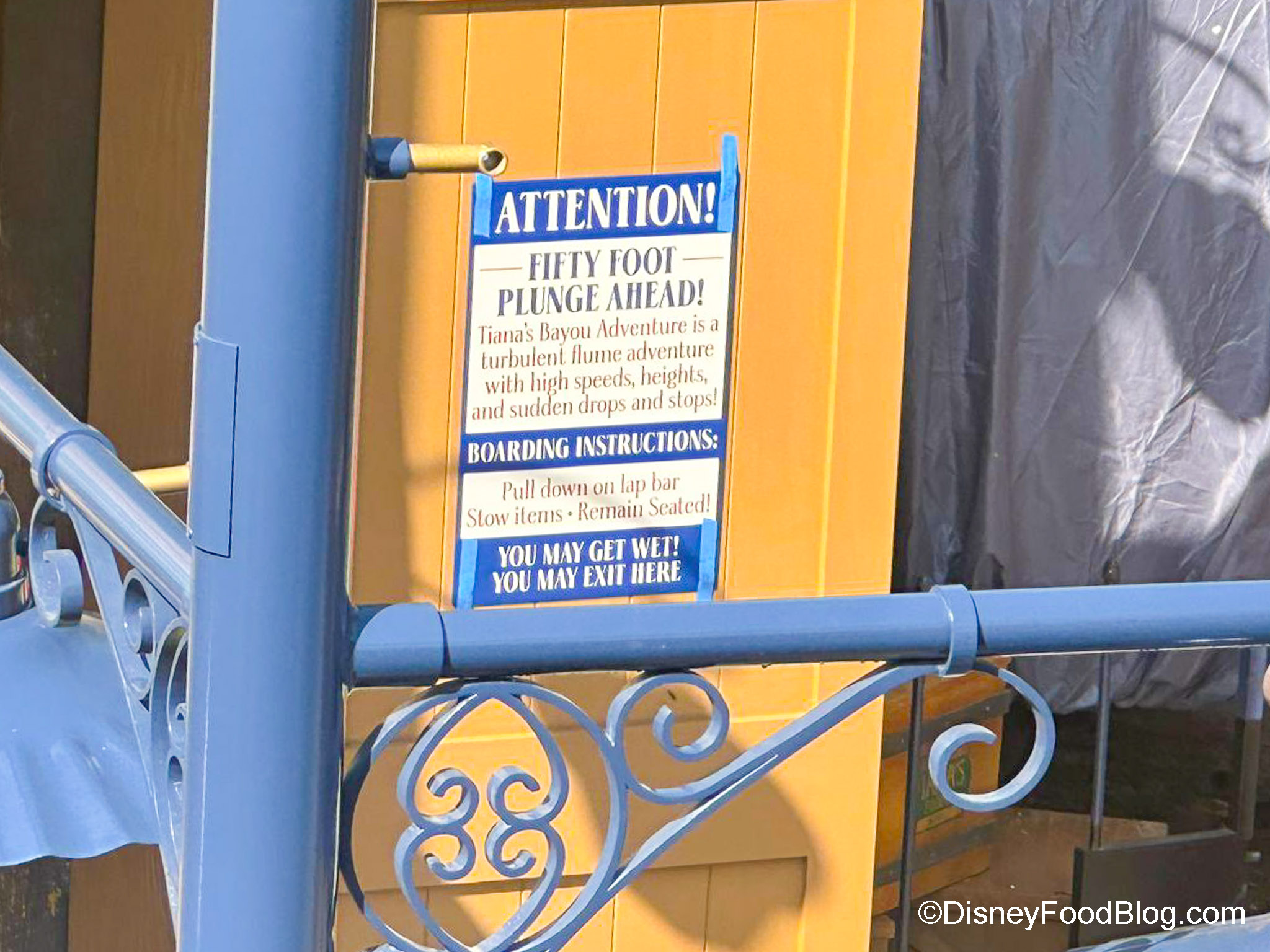 Another sign — quite literally — that this ride is getting closer to opening is an actual sign warning you that there’s a “Fifty Foot Plunge Ahead!” The sign also has some simple boarding instructions along with another warning: “You may get wet.” You know what that means, right? Bring those ponchos! This is also, apparently, an exit if you change your mind about riding.