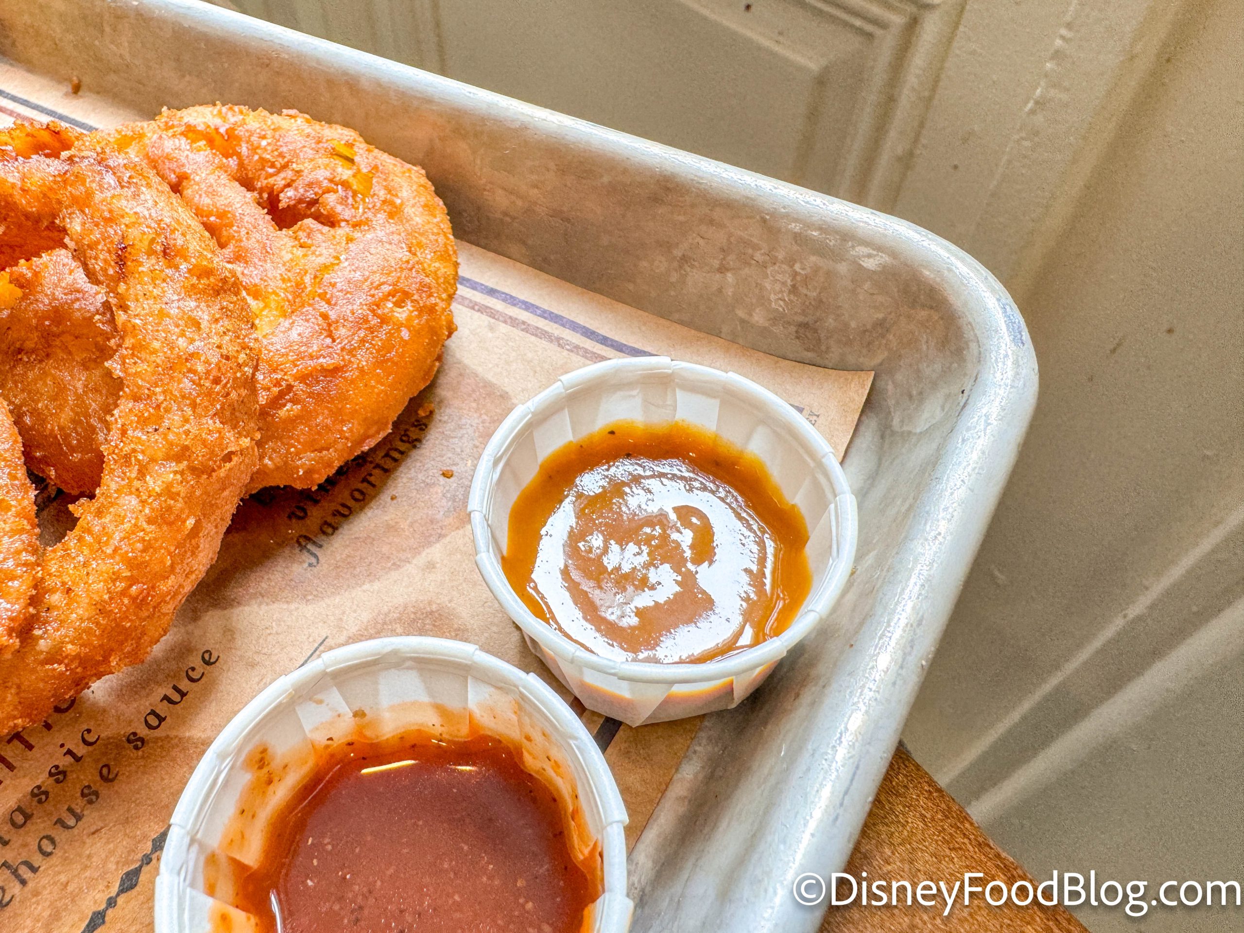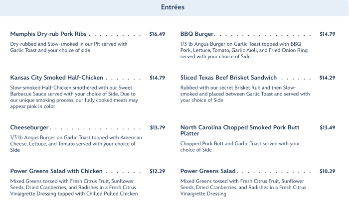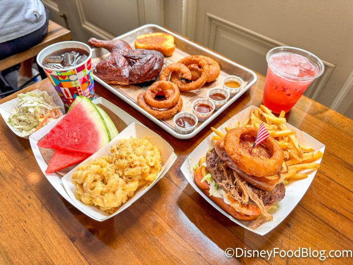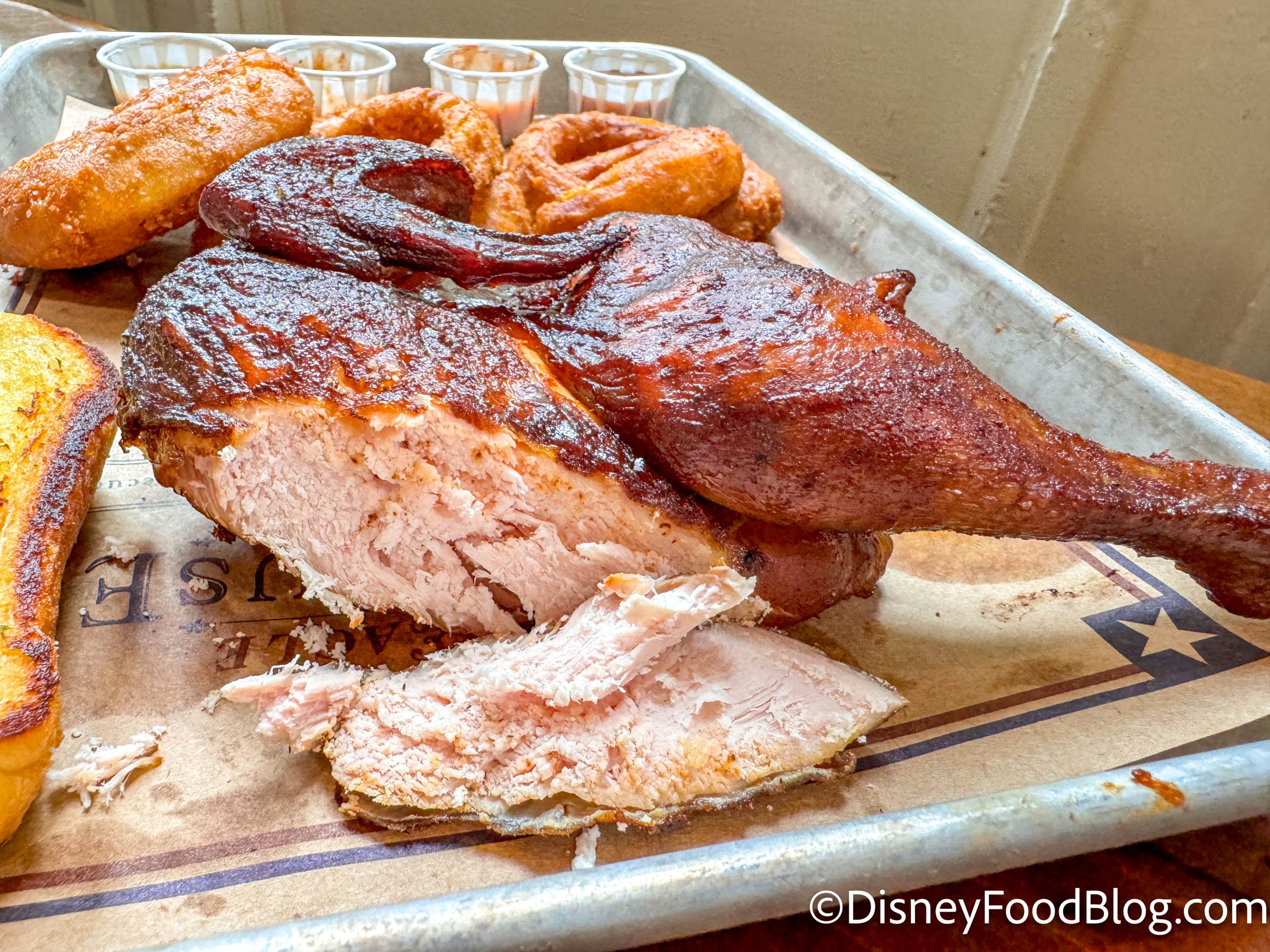 Last but not least, let’s talk about that Kansas City Smoked Half Chicken for $14.79. This comes with a slow-smoked half chicken with sweet barbecue sauce served with one side and a piece of garlic toast. Disney notes that due to their unique smoking process, your meat may appear pink in color, so don’t be alarmed if that’s the case!