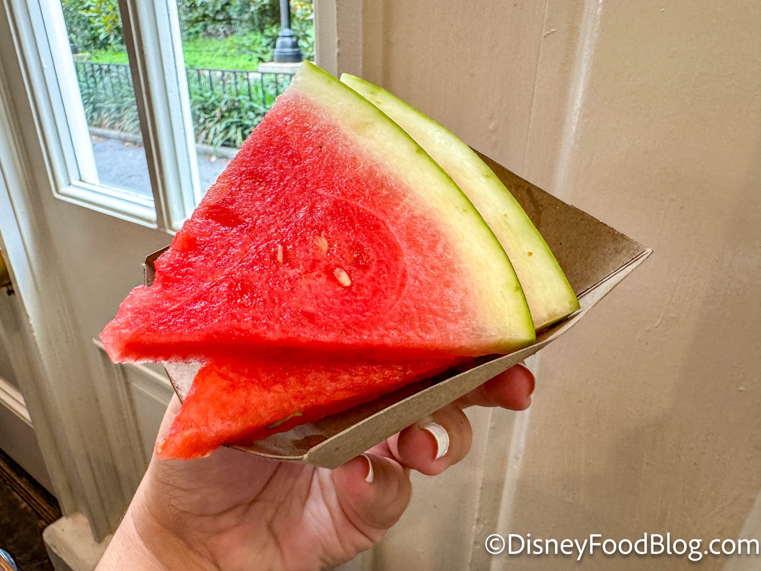 The watermelon is sliced thin and fairly basic. It was well-chosen, as it was sweet and very red in the middle. They gave me seedless slices (with no black seeds, just the underdeveloped white ones), so that would be easier for kiddos to eat.