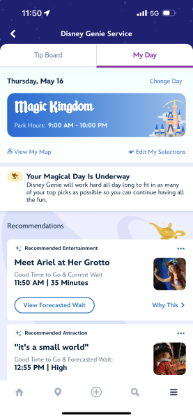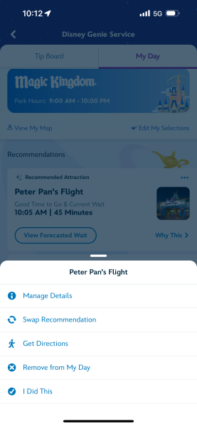 We were quite surprised to see it recommended we experience Peter Pan’s Flight first at a 45-minute wait, since that’s not typically what WE would recommend at 10AM. Especially since many other rides throughout the park were listed at only 15 and 20-minute waits. (Note: Later in the day, it jumped up to 65 minutes, so this was actually a pretty good recommendation!)