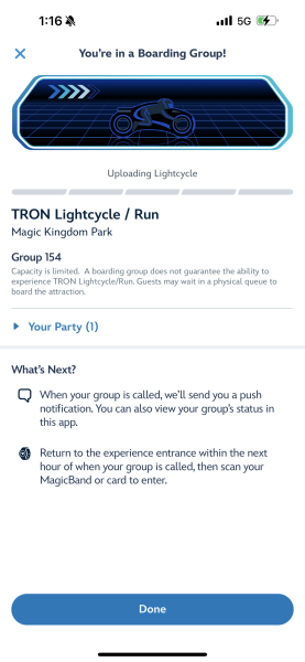 At this point, Disney Genie wanted to ensure that we knew we were eligible to buy an Individual Lightning Lane for TRON Lightcycle / Run, or that we could join the virtual queue. Even though it was 1:16PM and the second virtual queue drops at 1PM for TRON, we were still able to snag a spot!