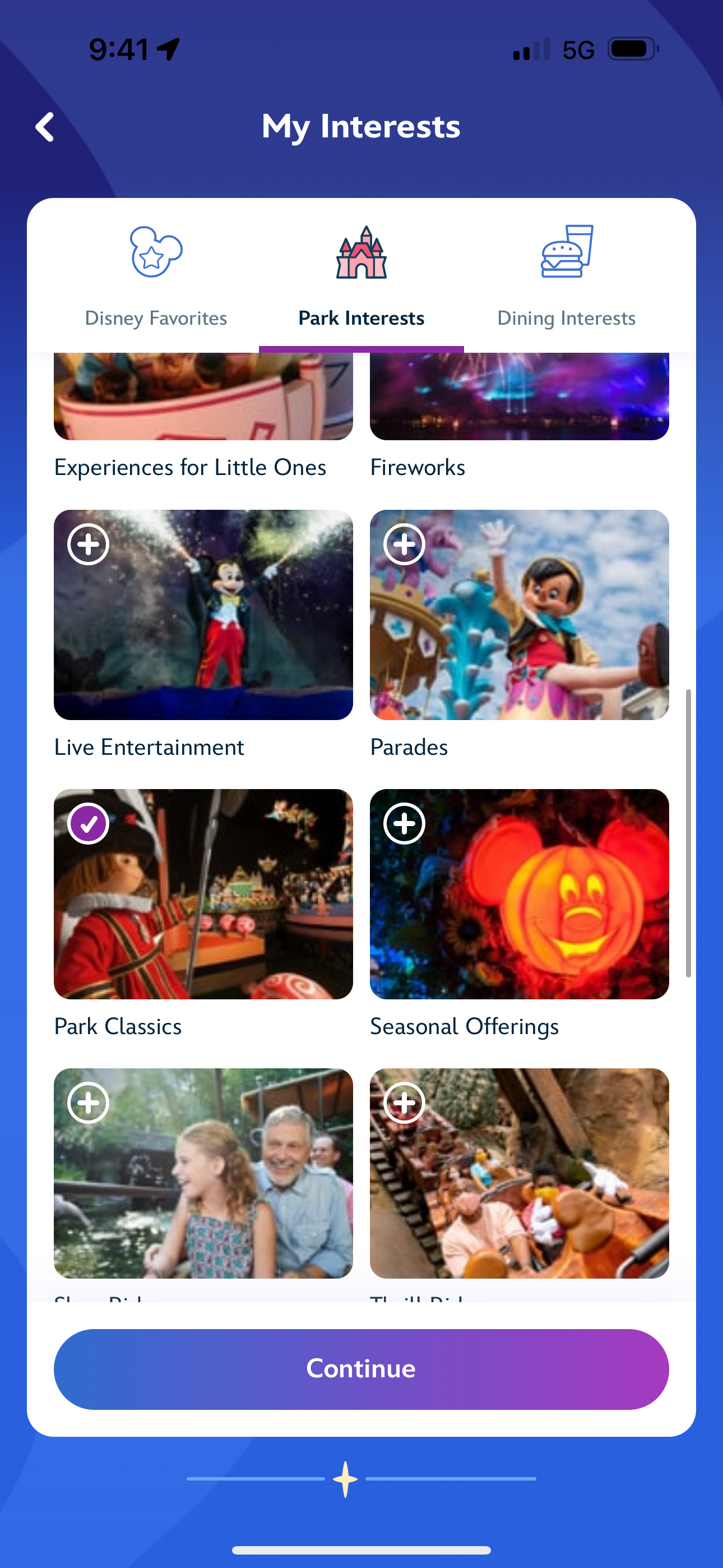 You’ll find Disney Genie in the Disney World app. The first step to using this free service is to put your interests in! Do you want to meet as many characters as possible? Or maybe you want to ride everything you can! Disney Genie will take this into account as it plans your day. For our experiment, we put in that we were interested in a variety of attractions, some character, and quick service dining, but did say no to table service dining. Disney Genie also let us know about the TRON Lightcycle / Run virtual queue and was more than ready to help us book our spot!
