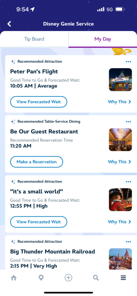 And before we knew it, we had our perfect plan for the day, according to Disney Genie! Each attraction and experience was listed with the time it was recommended we head to the attraction, and how long it was expected to take. We could also press a button to read more about why Disney Genie was suggesting it for us at that time.
