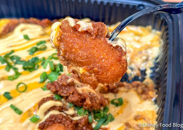 Sometimes Disney gets these fun ideas to mix different snacks or try something weird and unique, and it doesn’t always work (remember the funnel cake hot dog at Casey’s Corner for Disney World’s 50th anniversary? Our team had mixed reviews, but personally I thought it was gross 😂). Well, this is NOT one of those times. We think all the toppings and the nuggets together work really well!
