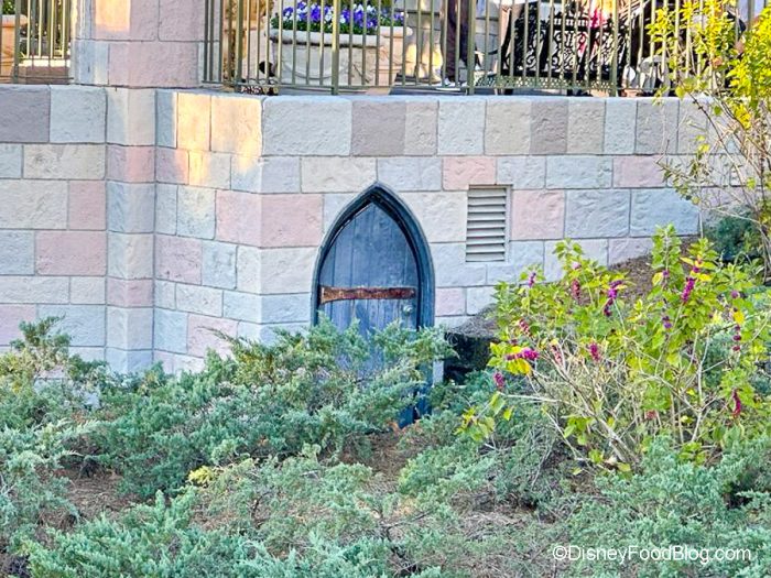 To start out, we’ve got this regal-looking door hidden in the wall surrounding Cinderella Castle. It looks as though it has been specially designed to fit in with the castle architecture. It has a lock with a spot for a key, so it’s likely an access door for something like plumbing or electrical, or a storage area.