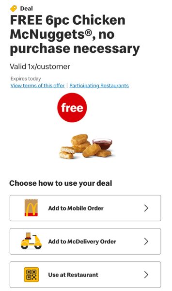 With this deal, you get a free 6-piece McNuggets and no purchase is required. You can use this in-app deal by adding it to a Mobile Order, adding it to a McDelivery order, or scanning it at the restaurant. It’s only valid one time per customer.