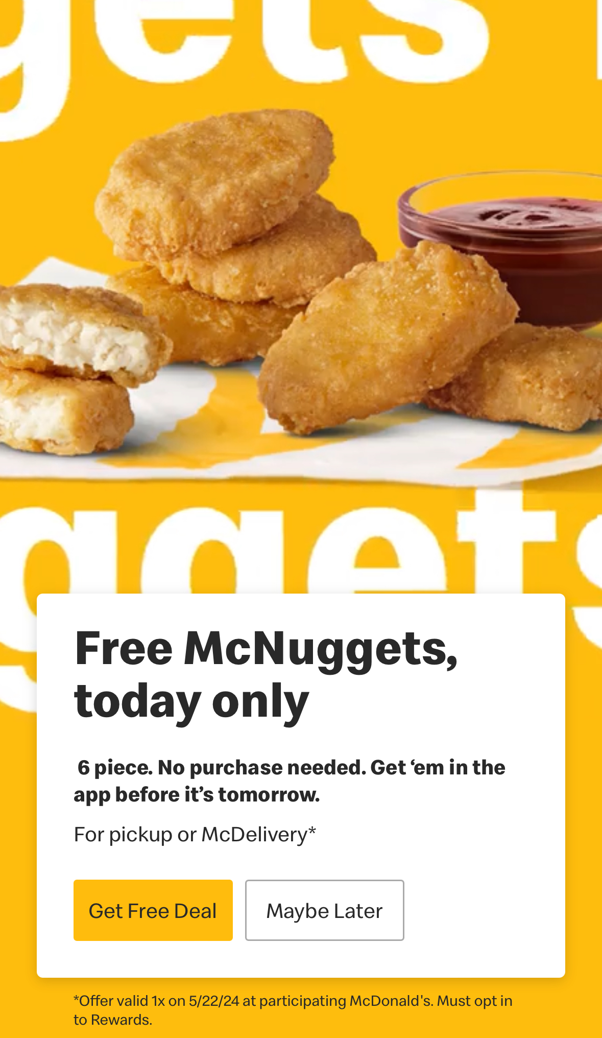 For ONE DAY ONLY — yep, today, May 22nd — you can get free Chicken McNuggets at McDonald’s when you use the app! When we opened our apps today, it was advertised on the homepage.