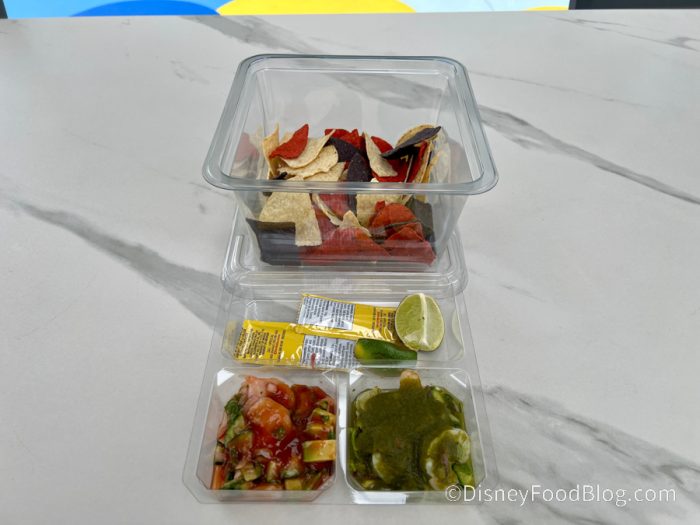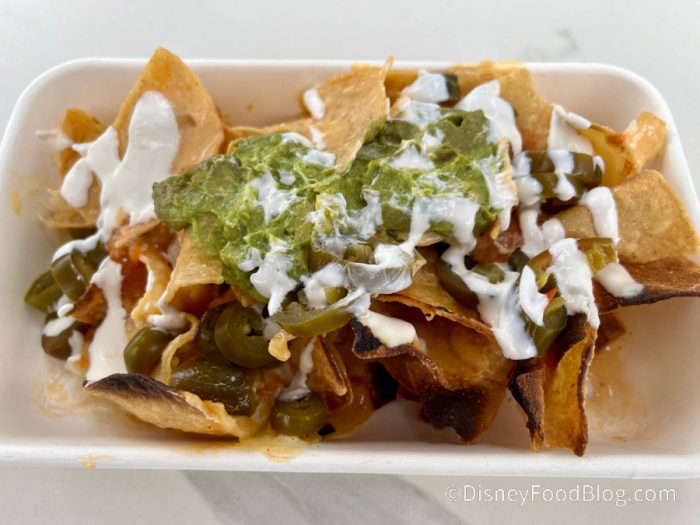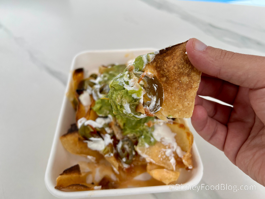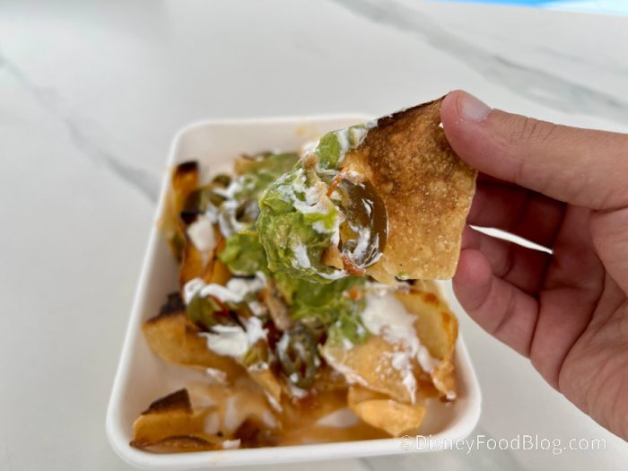 Overall, we thought the taste was pretty average. You could taste each individual topping, but the chips were kind of bland and this snack didn’t stand out, especially compared to everything else we ate. We recommend trying this with a protein option, but we also think it’s already expensive for nachos, so we understand if you want to give it a pass.