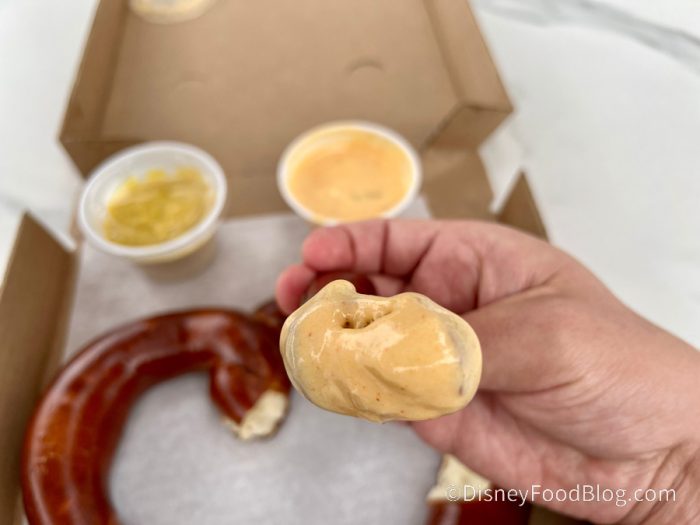 This large pretzel was very good! It was soft as advertised, very tasty, and the queso dip had a nice spicy blend that provided a flavorful kick.