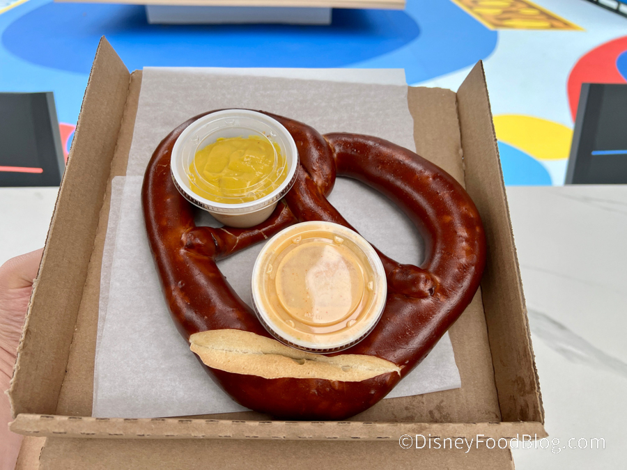 Next, we tried the Mega Soft Pretzel for $12. The pretzel is accompanied by cups of mustard and queso dip.