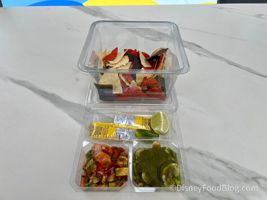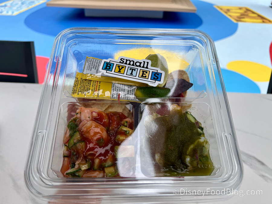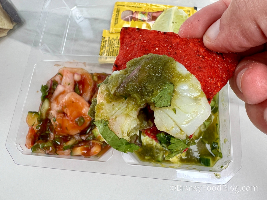 This ceviche comes packaged to-go in a nice compact kit that also includes limes and some Cholula sauce.