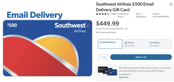 If you’re a Sam’s Club member, you can make these Southwest deals even sweeter! Currently, the wholesale warehouse chain is offering $500 worth of Southwest Gift Cards for $449.