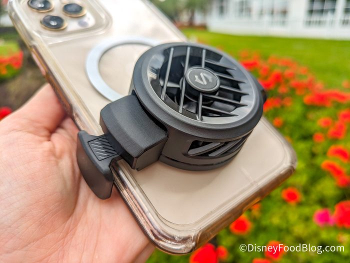 This is the Black Shark phone cooler, and it attaches right to the back of your phone. It’s about the size of any MagSafe charger that you might attach to your phone for extra battery life (also useful in the parks!). We also noticed that it’s very lightweight, which is great when you have to carry it around all day.