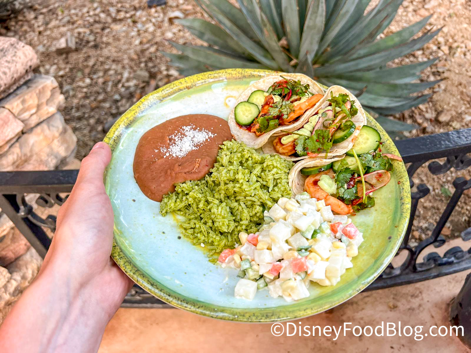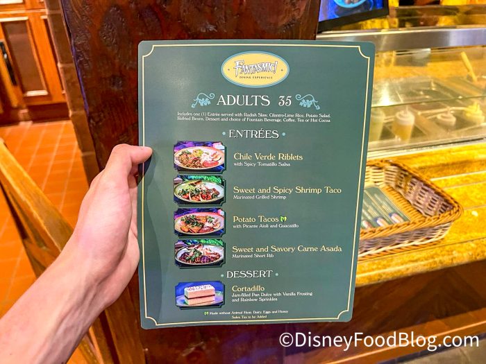 The dining packages for Fantasmic! include meals at one of three restaurants, Rancho del Zocalo, Blue Bayou Restaurant, and River Belle Terrace. They vary in cost based on the restaurant, but at Rancho del Zocalo, you’ll pay $35 per adult and $25 per child for lunch or dinner. The package includes a 3-course meal and reserved seating for one of the two Fantasmic! shows. So let’s get into the finer details of our meal and show!