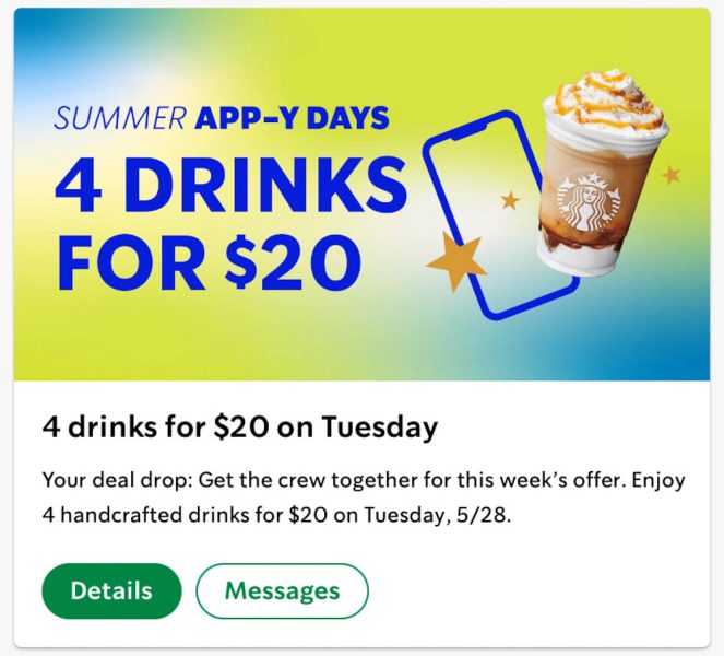 But that’s not the only discount we need to tell y’all about! If you head to Starbucks TODAY (May 28th), you can get four drinks for $20 total! There was no time restriction listed on the app, so it looks like this deal is good all day today.