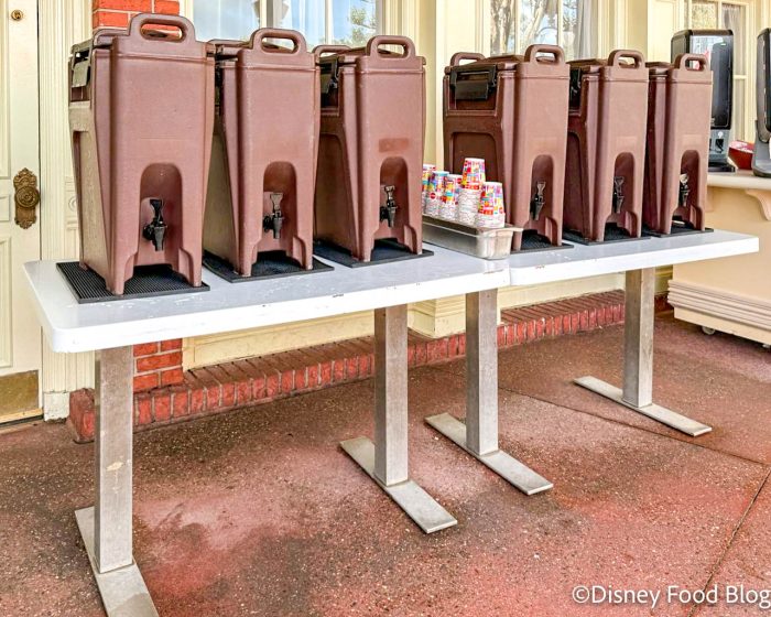 In Magic Kingdom, Casey’s Corner often has self-serve water dispensers out next to the piano during operating hours. We’ve also seen dispensers out and about in other parts of the park during the hotter season, though they aren’t guaranteed. But in this park, you might want to avoid the really busy quick service restaurants if you’re interested in just getting water and going to a snack stand instead — any stand with a drink machine will be able to make you a cup, and the line will likely be shorter.