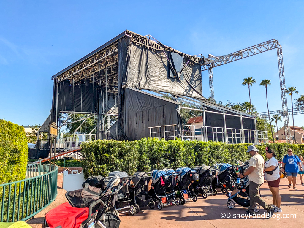 We happened to be in Disney’s Hollywood Studios the other day when we noticed a GIANT stage being set up in front of the Chinese Theater (Mickey and Minnie’s Runaway Railway). This stage is massive and takes up a good chunk of space. It’s so large and in the way that Disney has temporarily canceled the nighttime shows here.