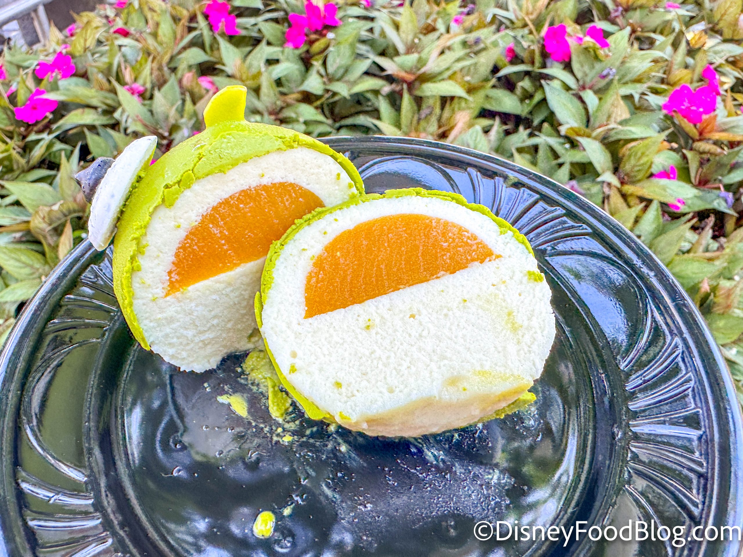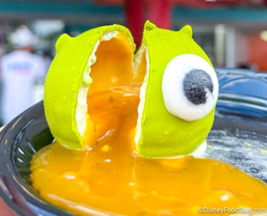 When I cracked open the 2024 Mike Wazowski Cake, he actually held together — go Mike! The green shell just tasted like white chocolate and it was nice and thin and easy to cut open. The white part of the mousse inside was mostly a plain vanilla flavor, but the orange blossom-mango REALLY comes through strong in the orange section of the treat. That bit is more of a gelatin consistency and it’s a STRONG tart flavor, on the verge of sour.