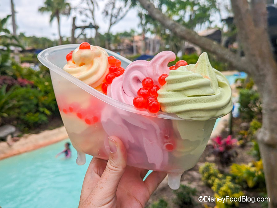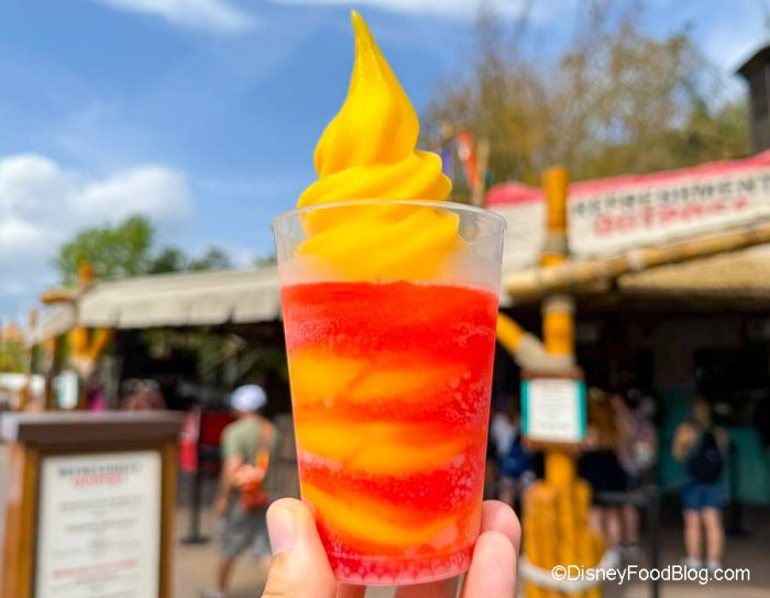Dole Whips also come in a variety of different flavors and forms. You can grab just a regular pineapple Dole Whip, or you can mix it up and grab a Dole Whip Float! We’ve seen them served with and without alcohol, in regular cups and in bathtubs (not kidding), and Swirls on the Water in Disney Springs will even let you grab a sampler flight to try three different flavors at once!