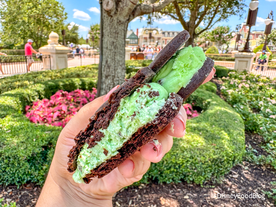 However, Disney World has come to the rescue (kind of) and released a Mickey Mint Chocolate Chip Cookie Sandwich that looks strikingly similar to the treat featured in the Disney Eats collection. The treat is a mouthful of words, and we are slightly confused as it is NOT an ice cream sandwich. But when we saw that we could get our hands on a similar treat, we had to try it!