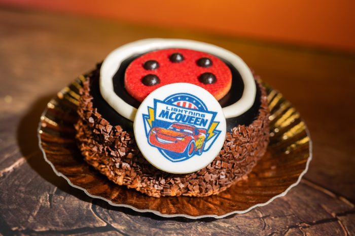- Lightning McQueen Spare Tire at Rosie’s All-American Café: Chocolate cake doughnut filled with raspberry jam enrobed in dark chocolate mousse, coconut glaze, chocolate flakes, and a chocolate coin