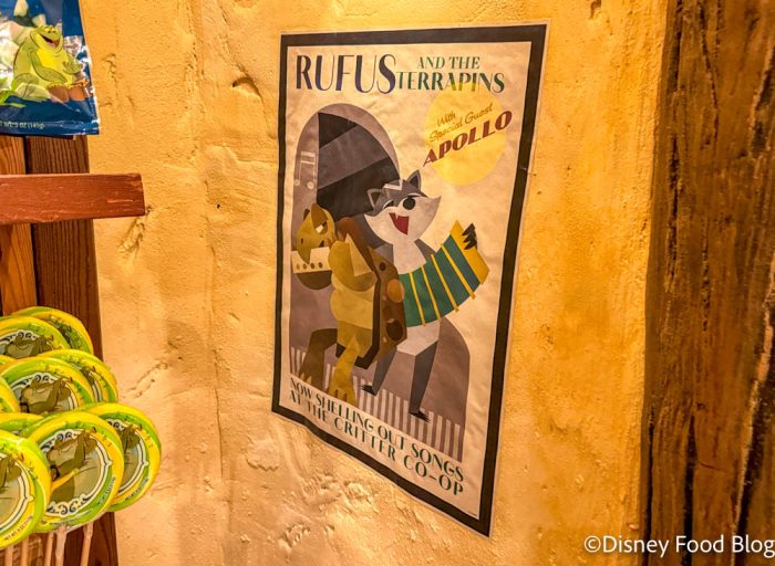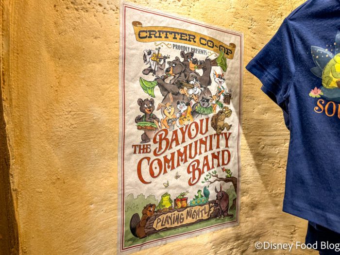 There are some cute nods to the ride and movie inside the shop, like this portrait of Tiana and the critters making gumbo together…