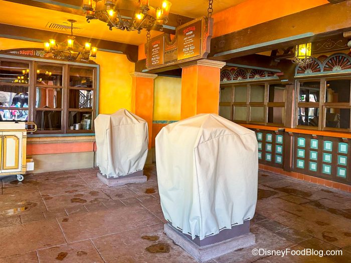 Now, to us, it looks like Tortuga Tavern is closed for good, which could indicate it’s about to get a massive makeover. However, we were also told by Cast Members that it was a seasonal closure, but we’re a little confused about that. If Tortuga Tavern was seasonal, wouldn’t it be open during the busy summer months (like now) like most of Disney World’s seasonal dining spots? Plus, the menu has been completely removed, too, which usually happens with a permanent closure.