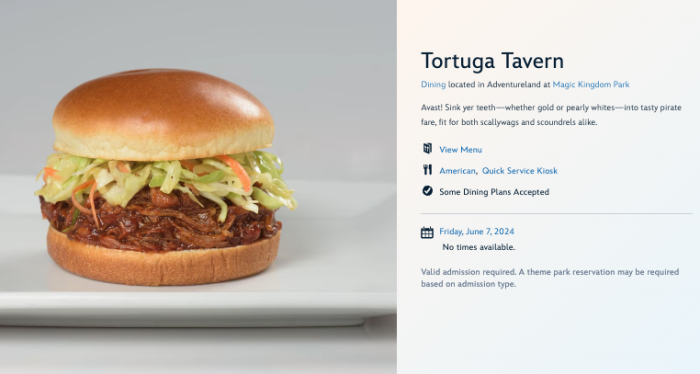 So we noticed that the Disney World website is now showing that Tortuga Tavern, a quick service location near Pirates of the Caribbean in Adventureland has NO hours. Hmmm…well, that’s curious.