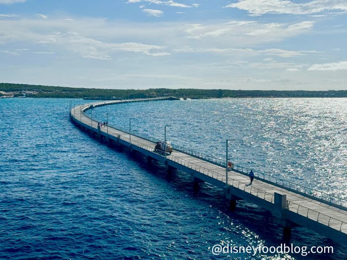 When you get to Lookout Cay, you’ll first find Mabrika Cove, which is the arrival point. According to Disney, “‘Mabrika’ means ‘welcome’ in Taino, the language of the Lucayans, who are considered the indigenous people of The Bahamas.” The pier is about a half-mile long, and takes about 15 minutes to walk.