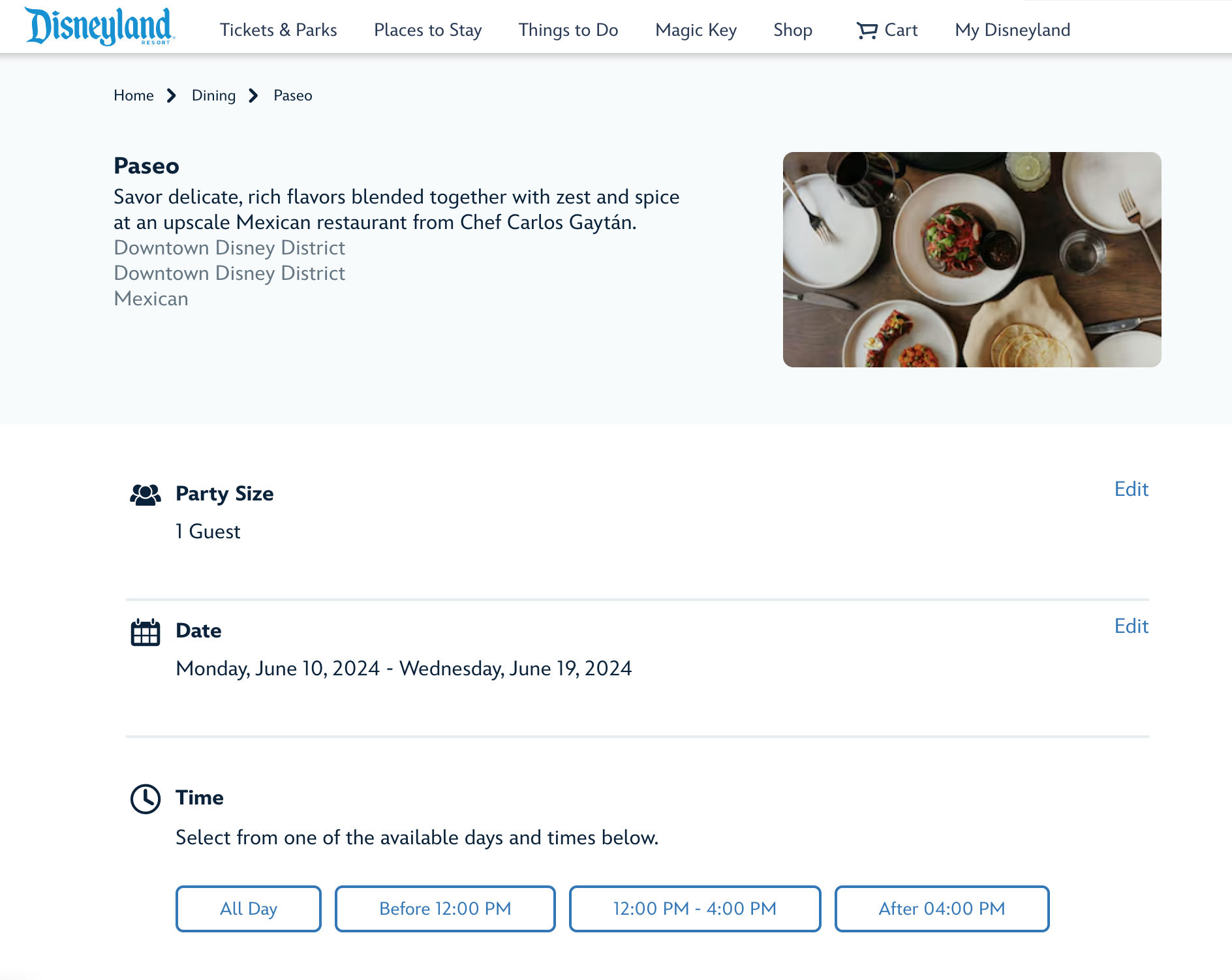 Now, if you don’t see reservations available, don’t worry just yet! We see last minute reservations pop up all the time for Disneyland Resort restaurants, so keep checking back before and during your trip to see if something opens up. And, the worst case scenario is you can grab some bites from Tiendita without any reservation needed!