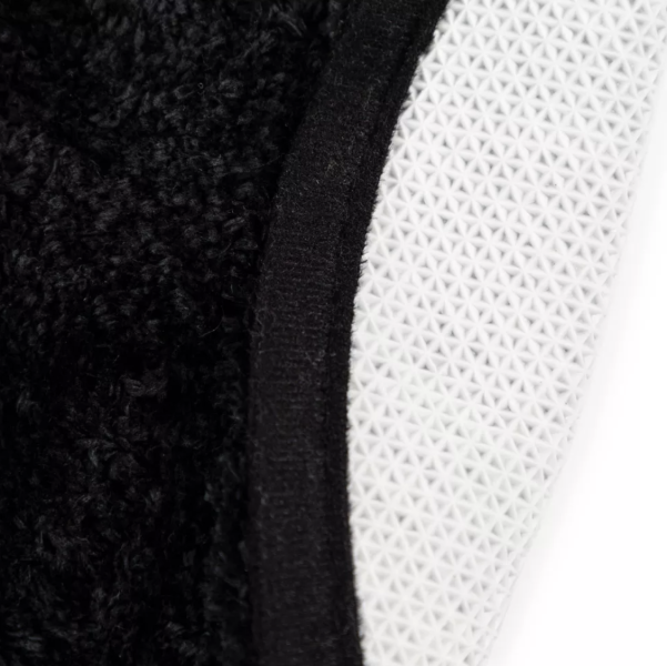 The Mickey rug is about 30 inches long and 26 inches wide. It’s made of polyester and has a latex backing, which grips the ground so it won’t slide all over the place.