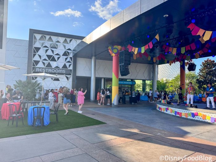 We also spotted EPCOT’s newest bathrooms within the CommuniCore Hall building. We love how hidden they look against the rest of the vibrant design in a deeper navy and light blue contrast…