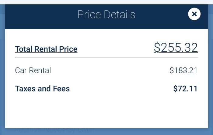 Wow! That looks quite a bit cheaper. Except, it’s not. The prices on the search screen are the rate for the car only — without taxes and fees. We’re going to try to match up the rentals exactly, so we’re choosing the “Pay Later” option here that offers free cancellation. So, here’s the total…