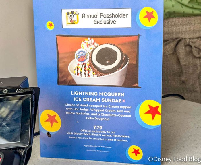 The Annual Passholder Exclusive Lightning McQueen Ice Cream Sundae can be found at Hollywood Scoops for $7.79.