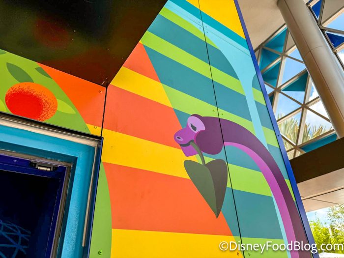 Also in the outdoor queue, we noticed some art that looks suspiciously like one of our favorite pavilions — is that The Land Pavilion that we see? These days, the pavilion is home to Living With the Land, Soarin’ Around the World, Awesome Planet, and Sunshine Seasons.