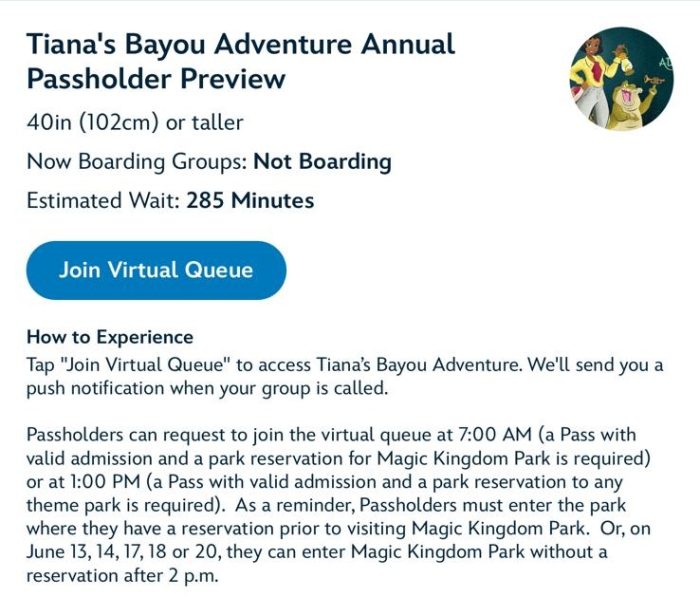 Disney World Annual Passholders have the opportunity to preview Tiana’s Bayou Adventure on June 13th, 14th, 16th, 17th, 18th, and 20th! Annual Passholders need a park reservation at Magic Kingdom on one of the preview dates to have the opportunity to join the 7AM virtual queue — or, make a park reservation at any of the parks to have the opportunity to join the 1PM virtual queue.