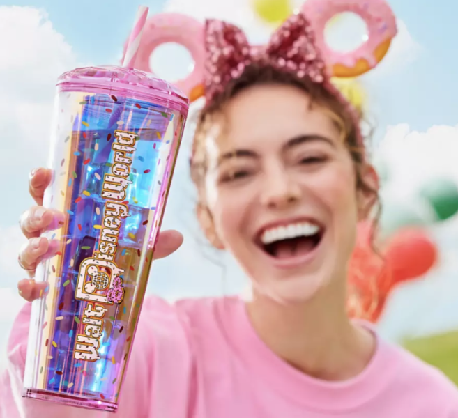 Starbucks, Disney, and doughnuts? Three of our favorite things mixed in one! This Disney World Starbucks tumbler’s design is so fun, featuring transparent pink walls with colorful sprinkles raining down it along with the iconic Starbucks logo on one side and “Walt Disney World” displayed on the other. And of course, we can’t forget the cutest (and probably delicious) pink Mickey doughnut pictured under it.