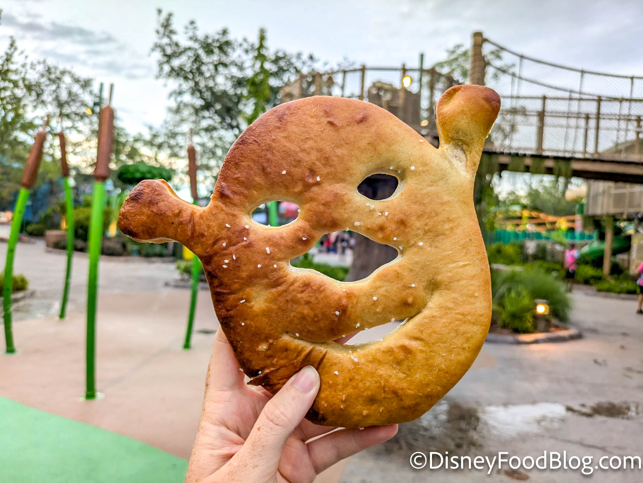 We also got to check out the iconic new snack, the Shrekzel! It comes with a cheese sauce on the side that tastes somewhere between the flavor of Disney’s plastic cheese and the spray cheese you get in a can. Our pretzel was soft and buttery!