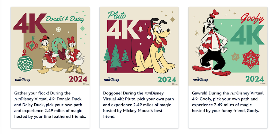 The virtual 4Ks are made up of three courses “hosted” by Donald & Daisy, Pluto, and Goofy respectively. As runDisney breaks down in their rules, “Participants track their own times, and completion is based on the honor system. Once you complete your run, visit the finisher website to submit your finish time and download your race certificate.”