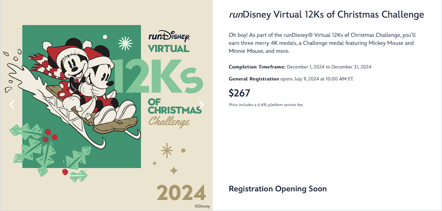 Registration for the event opens up on July 9th, and costs $267. As with other runDisney events, fees for the runDisney Virtual 12Ks of Christmas are “non-refundable and include a separate processing fee.” Disney also “reserves the right to revoke any registration for any race for any reason in its sole discretion with refund of any applicable registration fees being the sole remedy of any such refusal and/or revocation.”