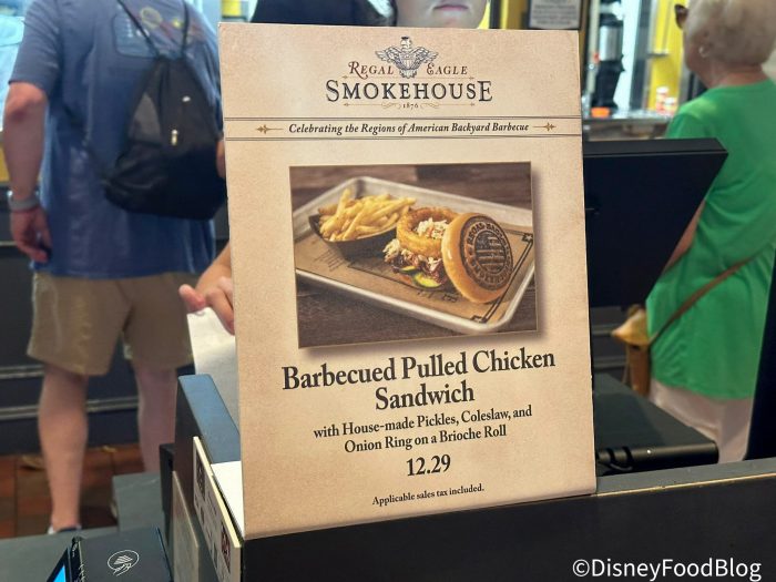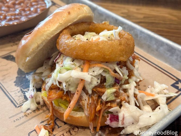 When we asked about the new dish, the Cast Member we spoke to said that it was a limited offering that’s only available on Tuesdays, Wednesdays, and Thursdays so we knew we had to try it right away! This new offering is called the Barbecued Pulled Chicken Sandwich, costs $12.29, and comes served with your choice of side.