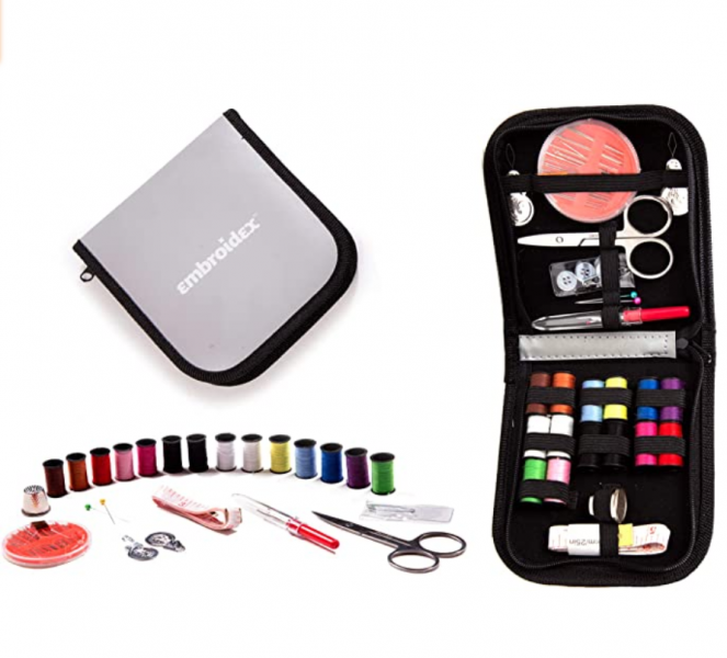 Mini sewing kits usually come equipped with a small pair of scissors, a needle, thread, safety pins, and sometimes a spare button or two. These kits can really save the day if you have a sudden wardrobe catastrophe and can be found on Amazon for as little as $5.