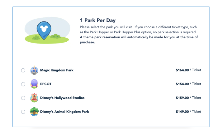 You can get tickets that give you access to 1 park per day, or you can opt for a ticket with the Park Hopper option. With the Park Hopper option, you can HOP between all 4 Disney World theme parks. Park Hopper DOES add a fairly significant cost to your tickets, but if you’re looking to jump around to different parks for meals or are trying to do it all in just a few days, it might well be worth the extra moolah.