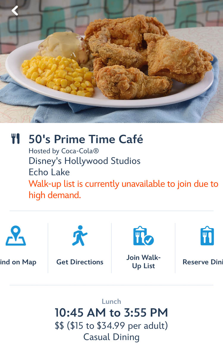 Of course, if there is no availability at the participating restaurant, you’ll see a notice on the page accordingly. (Which is why it’s still a good idea to TRY and get a dining reservation IF you want to avoid gambling on that walk-up waitlist availability.)