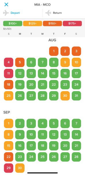 All you need to do is select your desired route (one-way or roundtrip) or hotel stay, and Hopper will show you a color-coded calendar. Green days are the cheapest, yellow and orange days are mid-range, and red days are the most expensive. The app also tells you the average price for each color to help you plan your trip for when it’s cheapest.
