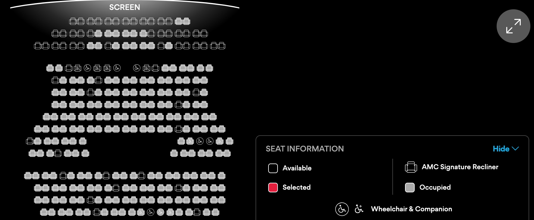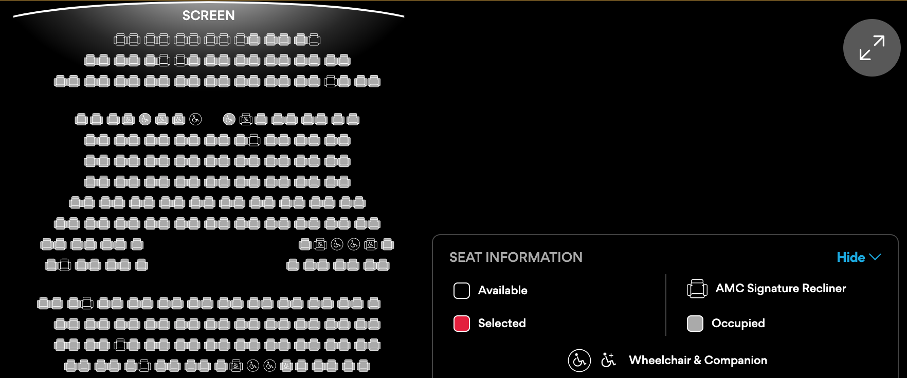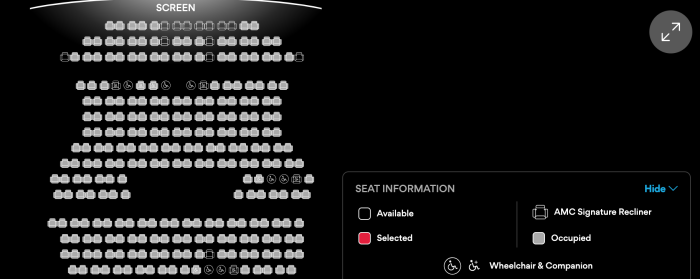 Even the later 10PM showtime is getting close to selling out, with some single seats throughout the theater, plus more availability in the front.