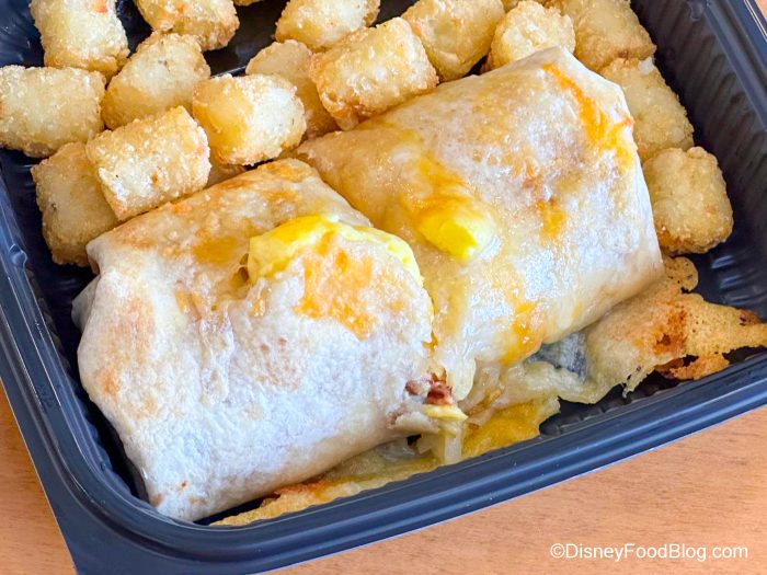 Let’s hop on the Monorail and take a quick trip over to Disney’s Contemporary Resort to visit Contempo Cafe. Two brand new breakfast items have appeared on the menu here, and we have to try them. First up is the Breakfast Burrito, which is a burrito made with Scrambled Egg, Bacon, Sausage, Cheesy Potato, and Chipotle Aïoli for $9.49. It’s breakfast wrapped in a tortilla, and we are here for it. This also comes served with Potato Barrels (aka tater tots), and they’re just you’re usual Disney tots: crispy and salty.