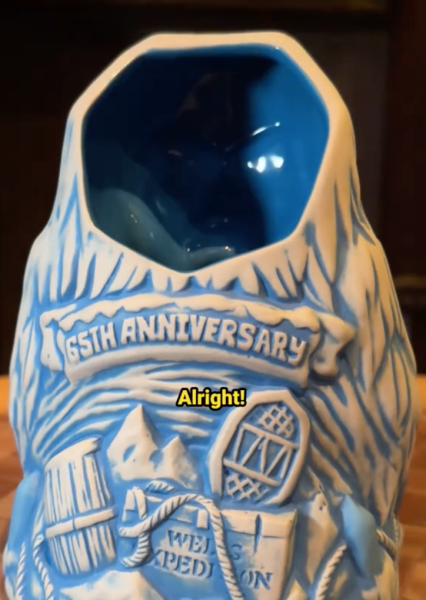 OK, so back on June 1st, Trader Sam’s Enchanted Tiki Bar at the Disneyland Hotel debuted a sweet Coconut-Pineapple Dole Whip in a brand-new Matterhorn Bobsleds 65th Anniversary souvenir cup. We gave it a try, and you can read our full thoughts in our latest review! And as much as we liked our cute little souvenir cup, we were hoping for something else. This is Trader Sam’s, after all. We want a tiki mug!