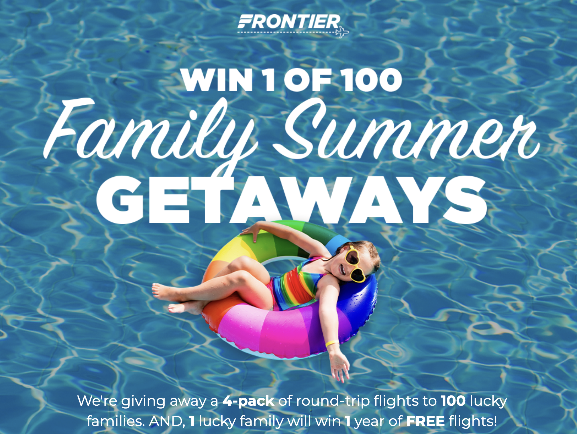 Frontier Airlines has just announced its Family Summer Getaway Sweepstakes with TONS of prizes to give away! 100 families will receive a FREE 4-pack of roundtrip flights to whatever destination they’d like (in the form of four $250 flight vouchers), and ONE lucky family will receive a whole YEAR of free flights (in the form of four $250 flight vouchers every month for 12 months)!